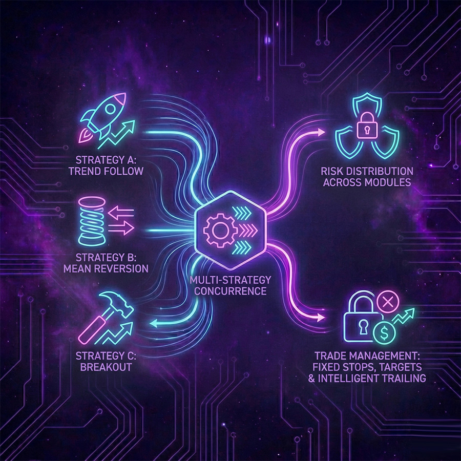 Multiple internal strategies operate concurrently, each following its own entry logic. Risk is distributed across these independent modules to avoid reliance on any single approach. Every trade uses fixed stops and targets, enhanced with intelligent trailing to secure gains while still capturing extended moves.