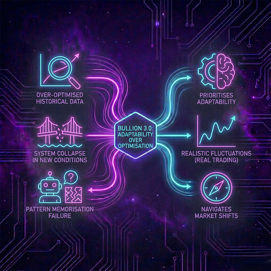 Bullion 3.0 wasn’t built to produce perfect backtests. It was built to survive the market conditions that destroy most algorithms.