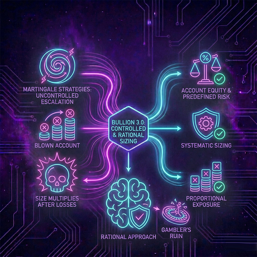 Martingale strategies expand position sizes after losses and eventually blow accounts. Bullion 3.0 uses controlled, systematic sizing based on account equity and predefined risk parameters. Losing trades do not trigger size escalation. Your exposure stays proportional and rational.